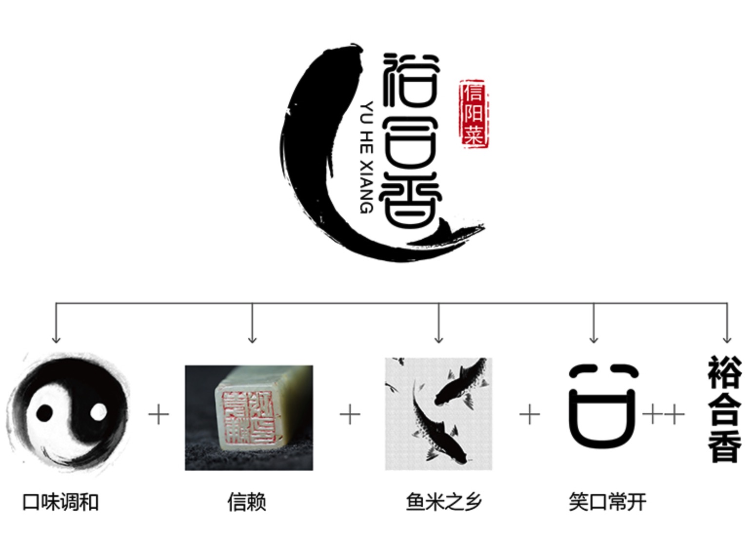 信陽菜品牌裕合香餐飲企業(yè)logo,核心關(guān)鍵詞信賴,歡樂,優(yōu)雅,年年有余,logo設(shè)計(jì)運(yùn)用到的理念有,陰陽太極圖案-調(diào)理陰陽,篆刻印章-中國(guó)特色,鯉魚圖案-魚米之鄉(xiāng),年年有余,字體變形形成笑口常開的圖案,笑迎五湖四海食客。