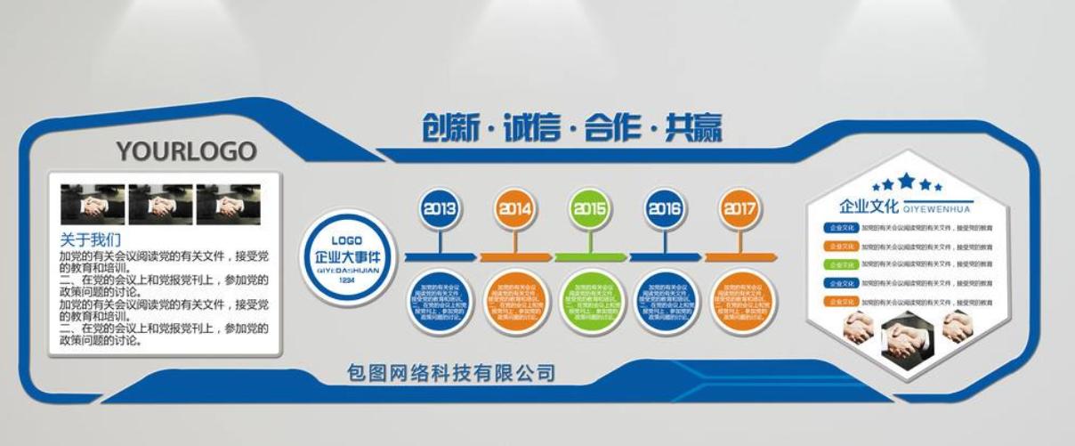 5.設計氣氛:企業文化墻力圖表達企業的整體形象,既要有時期感,又要有企業特征。因而,在文化墻設計中合理、標準地運用企業標志,不只能表現企業的特征,而且能到達鮮明的文化墻設計效果。文化墻的主色也可與企業規范色的應用相分離,或在規范色體系的范圍內合理延伸,使整個文化墻的作風與企業整體作風相分歧,并可在文化墻中進一步完善和優化。